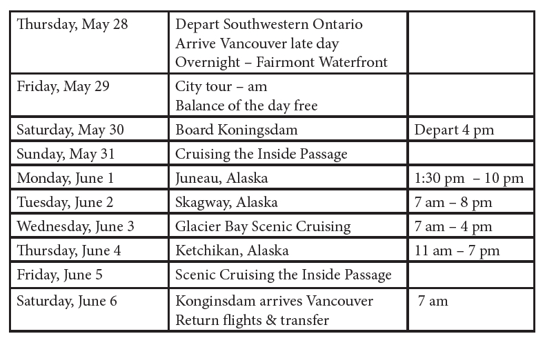 Cruise Package Rates in Canadian dollars based on double occupancy. Cruise/tour price includes 7 day cruise onboard Koningsdam, 2 night pre-stay Fairmont Waterfront, Vancouver, roundtrip airfare Toronto – Vancouver, transfers in Vancouver, coach transportation from Southwestern Ontario, all taxes and fees. A non refundable deposit of $1000.00 CDN per person is due at the time of booking. Final payment is due February 17, 2026. Single rates available based on Holland America’s terms and conditions. See Beyond Borders Travel & Tours terms and conditions. All cruise and coach tours depart from Sarnia & London, Ontario.